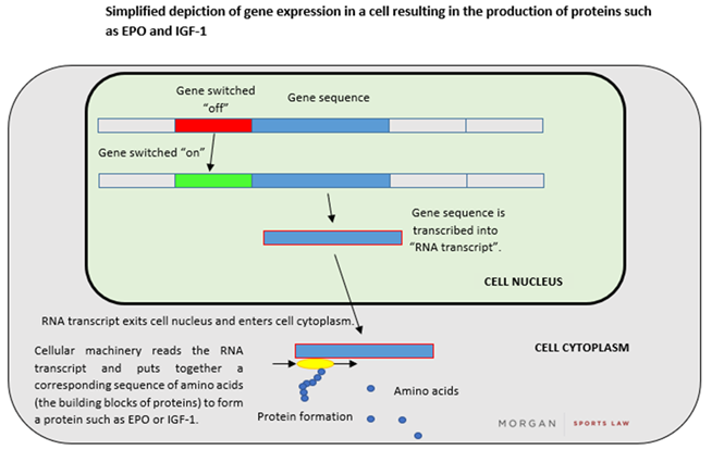A gene refers to a specific sequence of DNA letters that encode an individual functional unit or protein (such as erythropoietin (“EPO”), and, to use the example above, IGF-1). In human cells, a gene comprising double-stranded DNA is “transcribed” into a single-stranded "RNA transcript" which can be used as a template for the assembly of proteins – a process otherwise known as “gene expression”. A simplified depiction of this process is set out below: