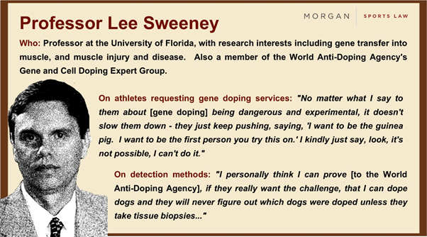 Further, there have been reports of athletes approaching scientists involved in gene therapy research. For example, Professor Sweeney – an author of the famous 1998 IGF-1 gene mice study – has said: