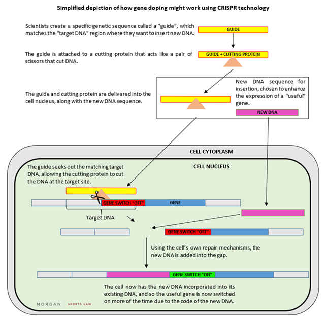 Instead of introducing entirely new copies of a gene in the manner described above, it is also possible to tweak the DNA around that gene to tune its expression level up. In other words, without inserting any new copies of a gene, the cell produces more of the RNA transcript. For example, in a study on mice, researchers edited a non-coding section of the mouse genome by inserting a sequence of DNA that increased the expression of the existing IGF-1 gene. The mice had a dramatic increase in their IGF-1 production and a number of the animals exhibited “clear muscle hypertrophy”. The technique used "CRISPR" which has been described as heralding a new dawn for gene therapy, given its scope for precisely editing a cell’s existing DNA. Indeed, a Chinese scientist recently claimed that he has created the first gene-edited babies, using CRISPR to disable a gene that allows the HIV virus to infect cells – which caused significant backlash globally. A simplified depiction of how gene doping might work using CRISPR technology is set out below: