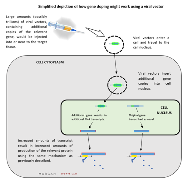 If a protein is advantageous for performance, it follows that more of that protein might allow for even better performance. There are numerous methods to increase the cellular abundance of a given protein, but one of the simplest methods involves delivering new genetic material into human cells. Such material can be introduced within a vehicle to carry it, such as a viral “vector” (a virus that has been partially disabled to minimise its harmful effects). Many viruses function by inserting their genetic material into the nuclei of host cells and co-opting the host’s protein production machinery to work on the newly inserted viral genes. This adaptation can be exploited to import and express the desired gene in the cells of athletes (in the same way as this adaption can be used in gene therapy).
